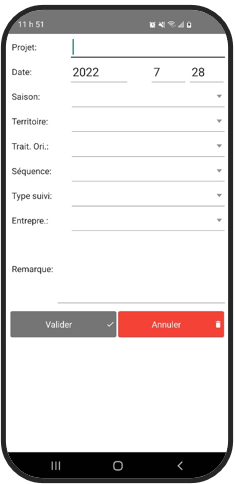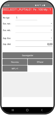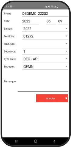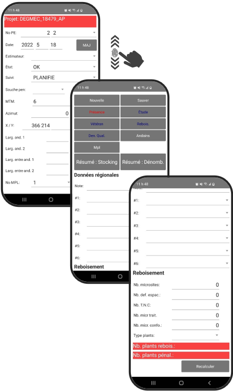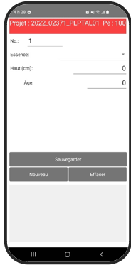 Remplissez selon l’exigence de vos devis les différentes fenêtres : ‘Présence’; ‘Vétéran’; ‘Dénombrement qualité’; ‘Étude’; ‘Reboisement’; ‘Andains’; ‘Micro placette’. Orhestrez la séquence dans 'Information de base' dans l'application PC. La coloration du bouton apparaitra en rouge selon l'ordre établit.