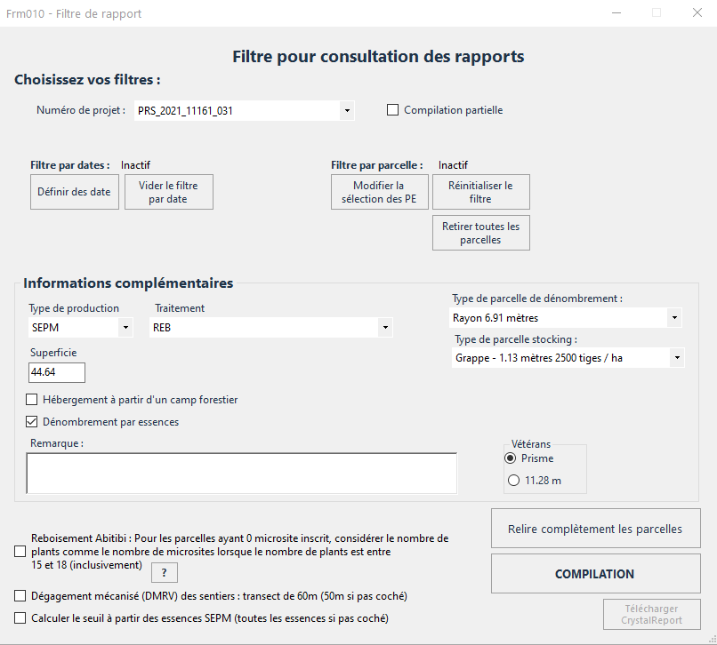 Consulter les rapports disponibles de vos parcelles réalisées. Vous devez cliquer sur «Consulter les rapports» dans la section «Poste de travail». Cette fenêtre permet de générer différents rapports en fonction de différents filtres.