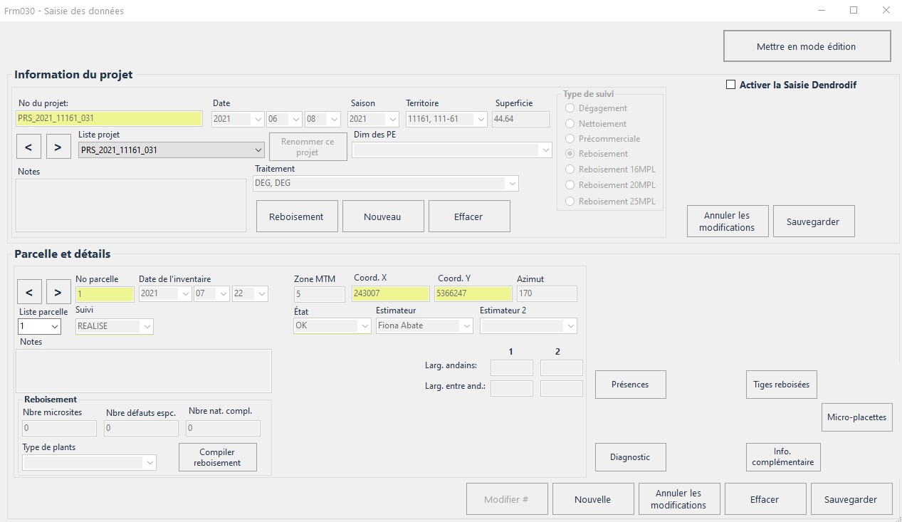 Cette fenêtre de saisie présente les informations de chaque projet et leurs parcelles. Les champs en jaune sont à remplir obligatoirement et ceux en blanc seront saisis habituellement sur le terrain (varie selon le territoire sondé, évidemment) ou permettent de répondre à certains besoins particuliers selon la région.