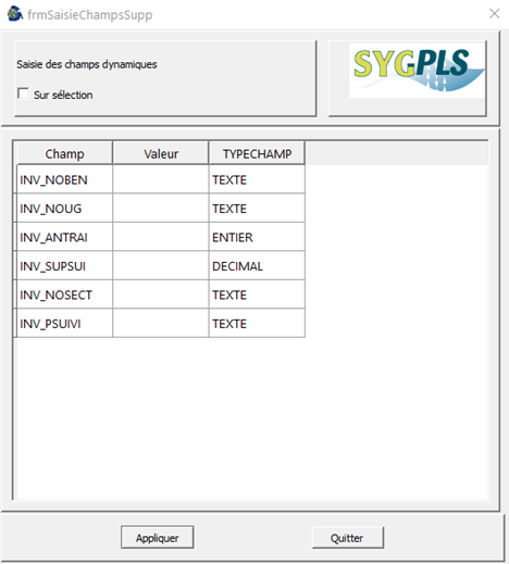 Si "Sur sélection" est coché, les champs peuvent être laissés vides c’est selon les besoins. De plus, ces champs peuvent être modifiés selon les besoins de chacun (Voir "Configurer vos champs"). Certains champs peuvent être obligatoire.