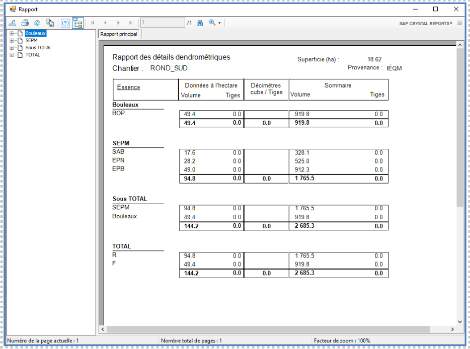 - Sélectionner l’option Détails dendrométriques pour afficher un rapport détaillant les données dendrométriques compilées. Vous pouvez exporter ce rapport en divers formats ou de l’imprimer au besoin.